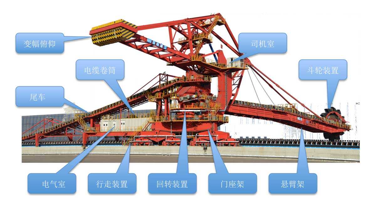 臂架型斗輪堆取料機 利用斗輪連續取料,用機上的帶式輸送機連續堆料的有軌式裝卸機械。它是散狀物料(散料)儲料場內的專用機械,是在斗輪挖掘機的基礎上演變而來的,可與卸車(船)機、帶式輸送機、裝船(車)機組成儲料場運輸機械化系統,生產能力每小時可達1萬多噸。斗輪堆取料機的作業有很強的規律性,易實現自動化。控