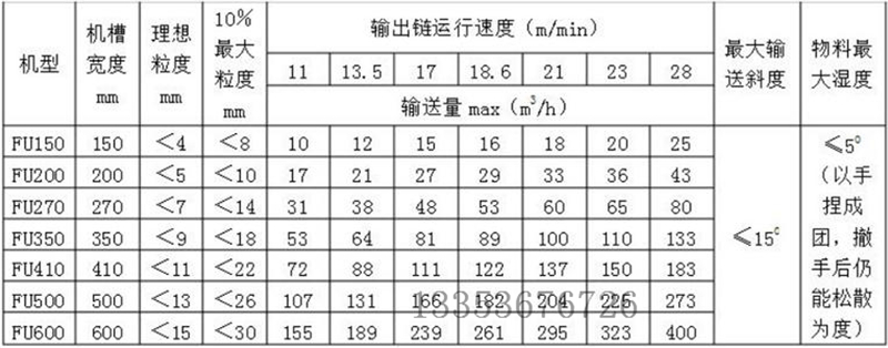 與其它類型的輸送機相比,FU鏈式刮板輸送機具有體積小、輸送能力大的優點,它只需皮帶輸送機1/5的空間或螺旋輸送機2/3的空間就能輸送相同流量的物料。輸送能力達6m3/h~500m3/h。